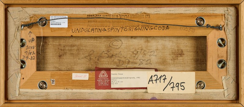 Bezeichnung: Signiert, datiert und bezeichnet verso: S. Boxer 9/82 D9-82. Sowie betitelt auf dem Keilrahmen: UNDULATINGSPINTOSIGHINGCODA.