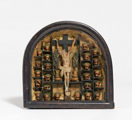KLEINER SCHAUKASTEN MIT KRUZIFIX FLANKIERT VON TOTENSCHÄDELN.
