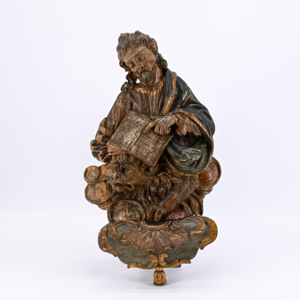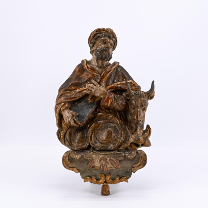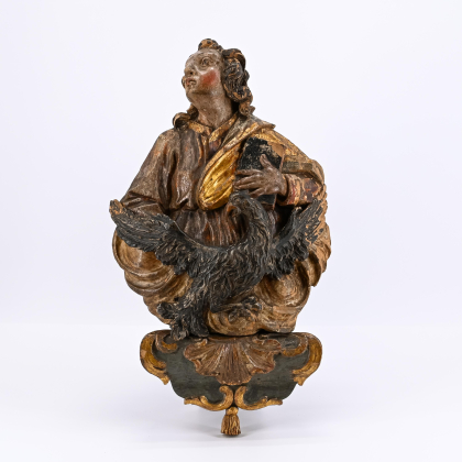 Beschreibung: Jeweils mit Konsolsockel der Evangelist Lukas mit dem Attribut des Stiers, Johannes mit