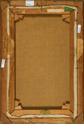 Minimal verschmutzte Malfläche. Partiell leichte Verschmutzungen, z.B. im Himmel rechts und im oberen Waldbereich links. Kleine Bestoßung mit Farbabplatzung in der Palme links des Zentrums. Zwei Flecken mit Krakelee im unteren Randbereich rechts und links der Mitte. Unter UV-Licht keine Retuschen oder Übermalungen erkennbar. Ansonsten guter Zustand. Das Werk wurde für die Katalogbeschreibung nicht ausgerahmt