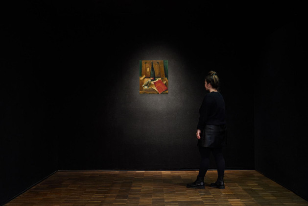 Leicht verschmutzte Malfläche. Minimales Krakelee in den pastosen Bereichen (am Papier, das an dem Buch lehnt kleine hochstehende Farbscholle). Ansonsten guter Zustand. Im Rahmen beschrieben.