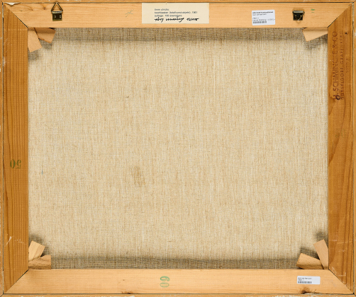 Technik: Aufgeklappter Tuschkasten auf weiß gefasster Leinwand. In Holzrahmen.
