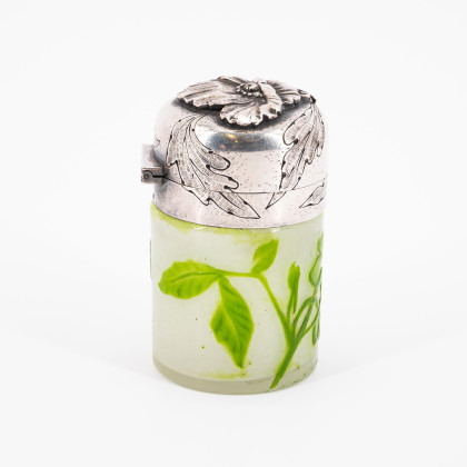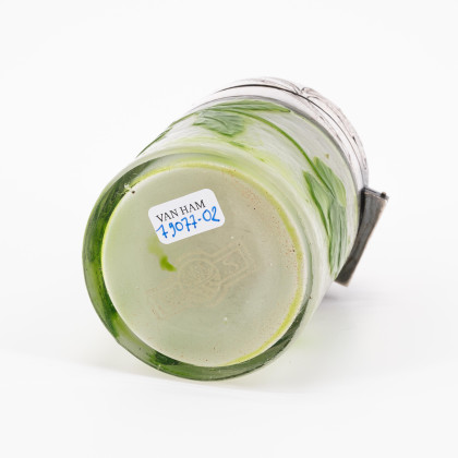 Material: Farbloses Glas, milchig weiß hinterfangen, Überfang in Grün. Silbermontierung.