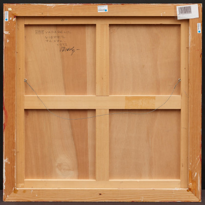 Bezeichnung: Signiert unten rechts: Vasarely. Signiert, betitelt, datiert und nochmals signiert verso oben links: VASARELY-NIEPES 1973 Vasarely. Hier zudem mit der Nummer 2709 und mit Maßangaben versehen.