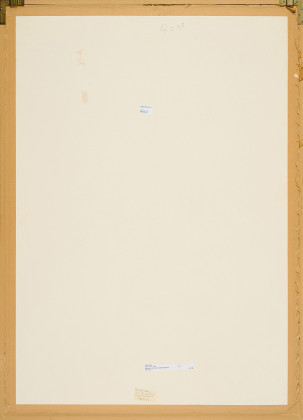 Blatt herstellungsbedingt leicht gewellt. Leichte Knickspuren sowie leichte Knickspuren an den Kanten, vereinzelt mit Papierverlust und Einrissen (Atelierspuren oder werkimmanent?). Verso montiert. Ansonsten guter Zustand. Im Rahmen beschrieben.