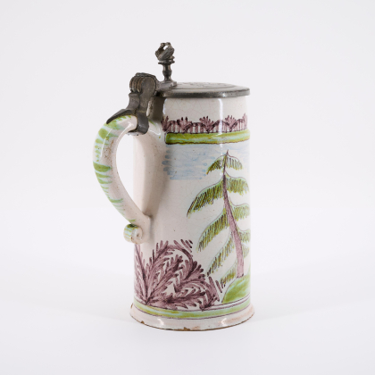 Technik: Keramik, rötlicher Scherben, weiß glasiert, polychrom gefasst, Zinndeckel.