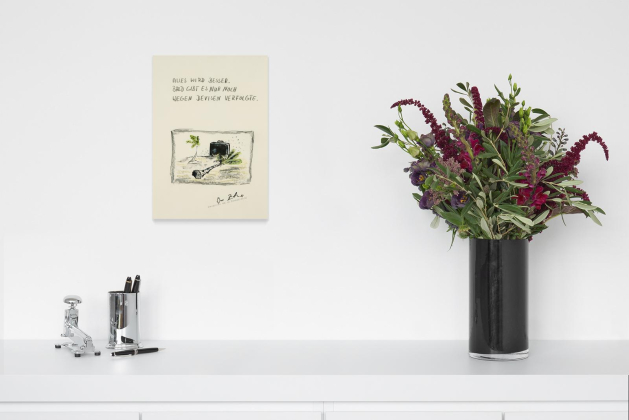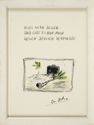 Bezeichnung: Signiert und datiert unten rechts: Werner Büttner 81. Sowie betitelt oben: ALLES WIRD BESSER. BALD GIBT ES NUR NOCH WEGEN DEVISEN VERFOLGTE.