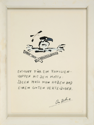 Bezeichnung: Signiert und datiert unten rechts: Werner Büttner 81. Sowie betitelt oben mittig: ENTWURF FÜR EIN FAMILIENWAPPEN MIT DEM MOTTO: IDEEN MUSS MAN HABEN UND EINEN GUTEN VERTEIDIGER.