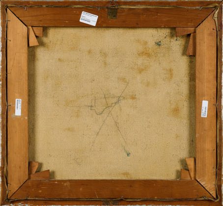 Minimal verschmutzte Malfläche. Falte mit minimalem Krakelee in der unteren linken Ecke. Punktuell leichte Verschmutzung am rechten Rand (Fliegenexkrement?). Ansonsten guter Zustand. Unter UV-Licht keine Retuschen oder Übermalungen erkennbar. Im Rahmen beschrieben.
