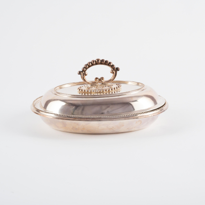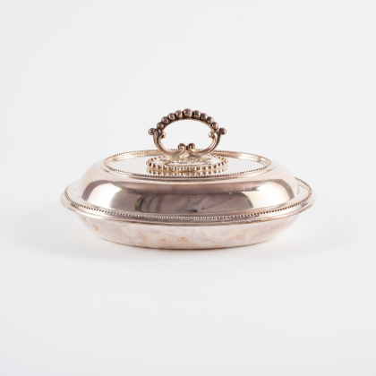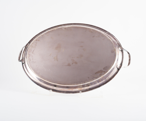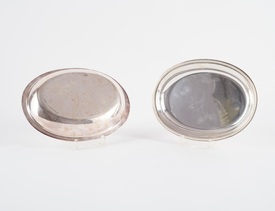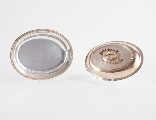 Mondsichel & Krone, Feingehalt 830, MZ. Zustand B. Beilage: Großes ovales Tablett (66x46cm), zwei ovale Deckelschüsseln, sechs Untersetzer. Versilbert.
