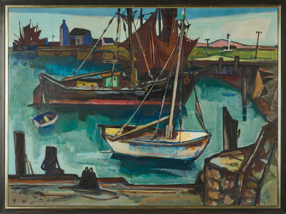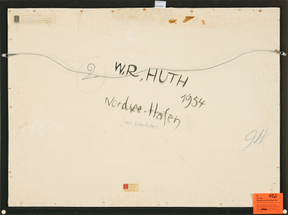 Bezeichnung: Monogrammiert und datiert unten rechts: WRH (ligiert) 56. Sowie signiert, datiert und betitelt verso: W.R. HUTH 1954 Nordsee-Hafen (mit Motorkutter).