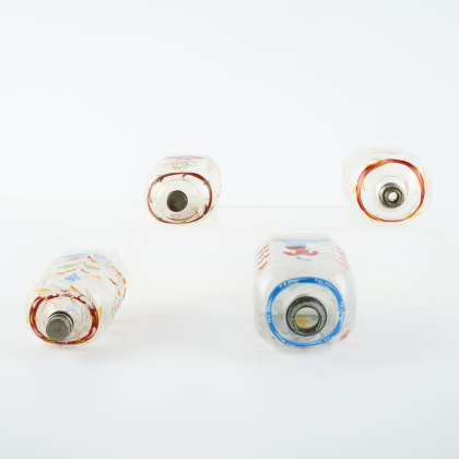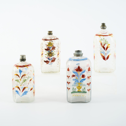 GRUPPE VON VIER GLASFLASCHEN MIT FARBIGEM EMAILDEKOR.