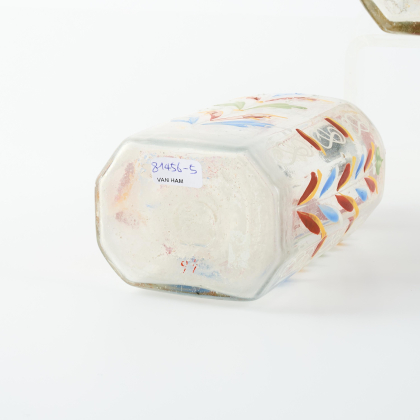 Technik: Farbloses Glas, Emaildekor, Zinnverschlüsse.
