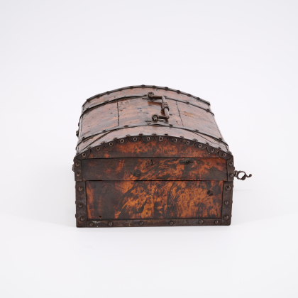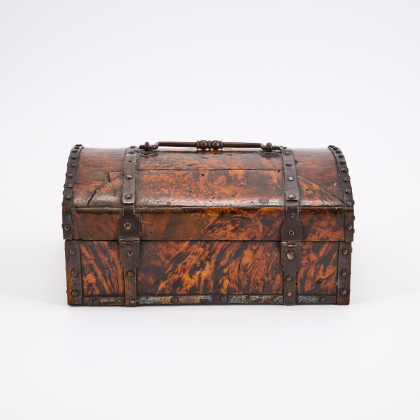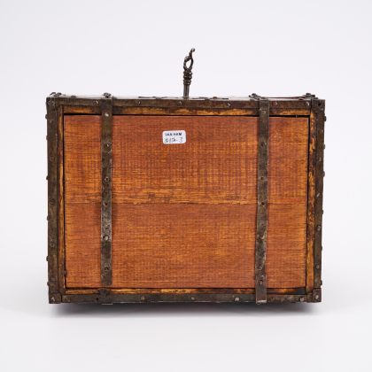 der Außenkanten und quer über den Deckel verlaufende Eisenbänder.