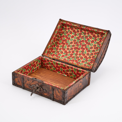 Beschreibung: Rechteckige Form mit scharniertem, leicht gewölbtem Deckel. Dieser mit Bügelgriff. Entlang