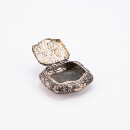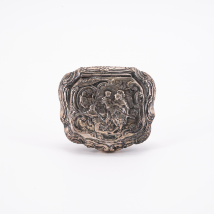 DOSE IN KARTUSCHENFORM MIT MYTHOLOGISCHER SZENERIE.