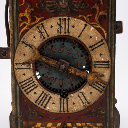einem außenliegendem Hammer in einem Glockenstuhl mit Blumenranken eingehängt. Die Frontplatine polychrom bemalt mit Ranken auf rotem Grund, oben Cherubskopf und unten am Rand einem schachbrettartig gefliestem Boden. Das gemalte Ringzifferblatt mit römischen Stunden und einem Stundenzeiger mit einer zeigenden Hand an einem Ende und einer Mondsichel am anderen Ende. Darin mittig die Weckerscheibe mit Stecklöchern für einen Stift und arabischen Ziffern. Geh- und Schlagwerk mit Spindelhemmung und Waag (Foliot), Stundenschlagwerk mit innen verzahnter Schlossscheibe und großem, außenliegendem Windflügel.